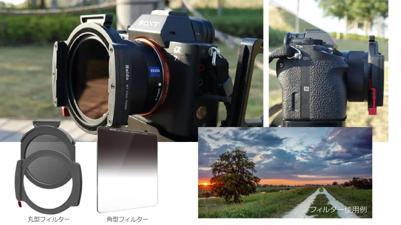 ミラーレス一眼に最適な小型角形フィルターシステム。37~67mmのレンズに対応。