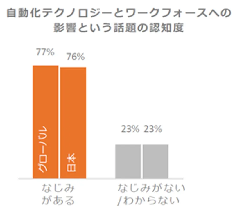 ロボティクスや自動化テクノロジーがワークフォースにどのような影響を与えるかの概況を知った結果、テクノロジーに関して追加のトレーニングや現場実習を受けることへの関心を少なからず持っているのは4人に3人となっています(「ぜひ受けたい」+「まあ受けたい」割合日本:75%、グローバル:69%)。