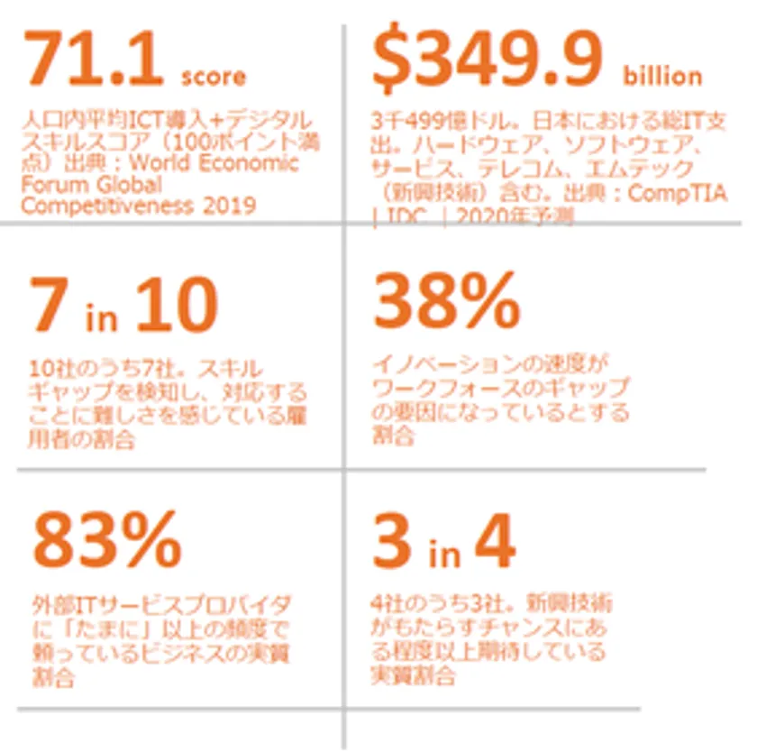 IDCが行った調査によると、グローバルなIT業界が引き続き伸びており、2020年には、全世界における支出額が5兆2,000憶ドルに達するということです。日本におけるIT支出は2020年には3千499億ドルに達すると推定されています。グローバルマーケットについては、CompTIAのIT Industry Outlookを参照してください。(※ https://www.comptia.jp/about/library/ ) 支出カテゴリの組み合わせはさまざまです。世界各地のビジネスは、ハードウェア、ソフトウェア、サービス、そしてテレコムに投資をしています。日本の企業が主要な戦略における優先対象として、新たなシステム及びプロセスの実装(58%)、新たな顧客および市場セグメントの識別(49%)、新製品の上市(48%)、イノベーション(47%)などに力を入れている中、テクノロジーはさらに必要不可欠な役割を担うことになるでしょう。将来に向けてのテクノロジー計画の助力となるような、スキルを持った人員を雇用することも優先事項であると答えた企業も3分の1以上あります(37%)。