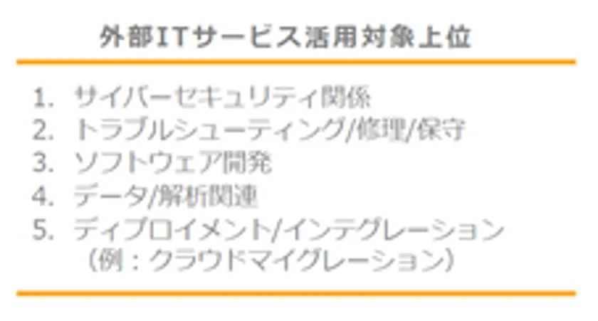 下記以外のいろいろなサービスについても、日本企業は外部の専門知識に頼っています。コンサルティング/アドバイザリー/戦略サービス、ウェブデザイン、そして新興技術などの分野です。さらに、10社に1社がマネージドサービスプロバイダ(MSP)を実行中のITマネジメントに活用しています(11%)。興味深いことに、定期的もしくは頻繁に外注している企業が、素晴らしいもしくは満足のいくROIと報告する割合(成熟した日本のような国では65%)は、たまに外注する(60%)、またはあまり/まったく外注しない企業に比べて(57%)高くなっています。