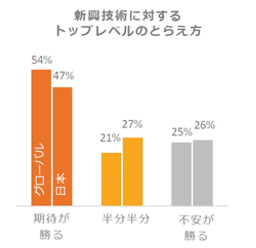 CompTIAの調査によると、ほぼ半数の日本企業は新興技術を前向きにとらえています(47%)。おそらく、回答者は自分たちのビジネスに特化した機械を見つけているのか、あるいはより幅広く、技術の向かう方向に対して全般的にワクワク感を抱いているのでしょう。その一方で、26%は不安が先に立つと述べています。ここでも、そう答えたのは自分の会社に特化した面を見ている可能性があります。例えば市場で取り残されてしまう不安、あるいは技術的破壊の不確実性に対する漠然とした懸念などです。成熟しつつある国グループにある組織は、新興技術の機会をより強く希求する傾向にあります。(成熟途上国では61%;対して成熟国では49%)