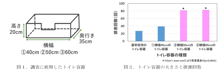 調査の結果、横幅40cmのトイレ容器での排泄回数は39回(総排泄回数に占める割合は16.9%)、50cmでは82回(同35.5%)、60cmでは83回(同35.9%)となりました。また通常使用しているトイレの排泄回数は27回(同11.7%)でした(図2)。この結果から、横幅50cm以上のトイレ容器における猫の排泄回数が全体の7割強を占めることが確認されました。