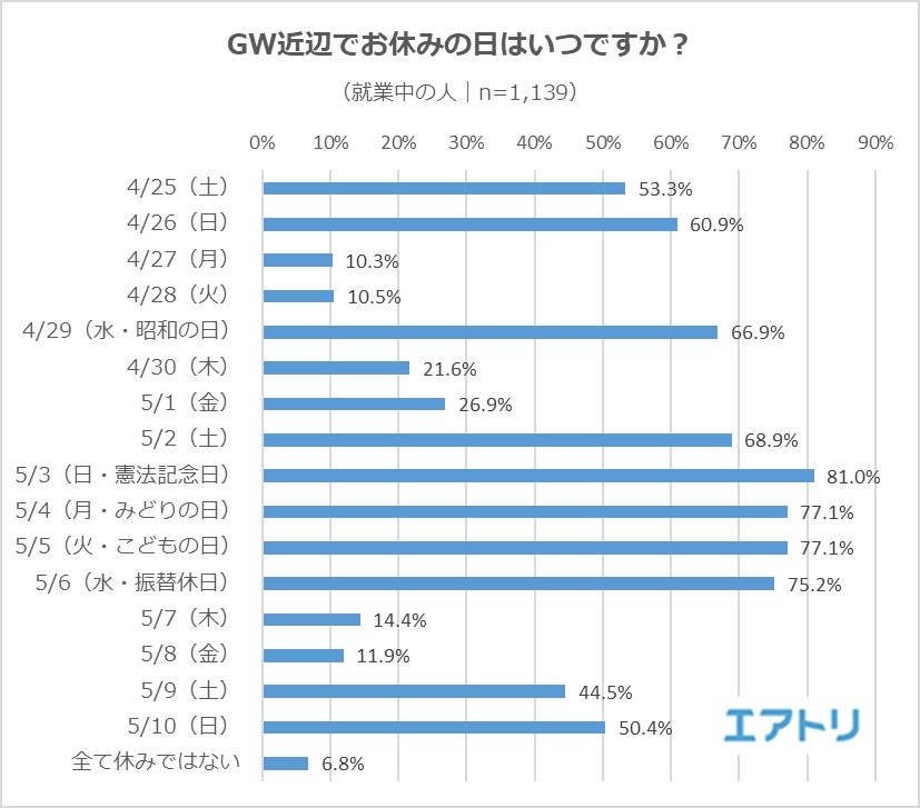 5/3~6は7割以上がお休み。平日は4/30・5/1に休む人が最多に。
