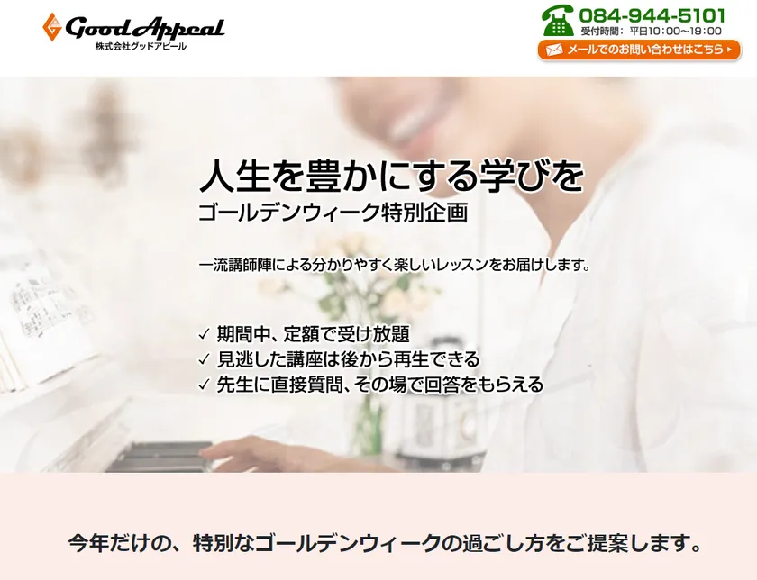 株式会社グッドアピール(本社:広島県福山市/代表取締役:佐藤幸治)は、来るゴールデンウィークに自宅を学びの場に変えるオンラインレッスンを開催いたします。