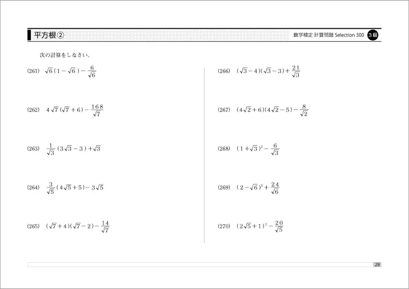 当協会が実施している実用数学技能検定(数学検定)の1~5級は、1次:計算技能検定、2次:数理技能検定で構成されており、計算技能検定では、学習内容のなかで重要な計算問題を中心に出題しています。今回刊行した「計算問題Selection」は、計算問題に集中して取り組めるように、過去に数学検定準2~5級で出題された問題をもとに、主要な計算問題のみを厳選して掲載いたしました。これにより、短期間で計算の能力を定着させたい方にも最適な構成の問題集になっています。今後は、図形問題や文章題など、過去問題をジャンル別に再構成することを模索してまいります。
