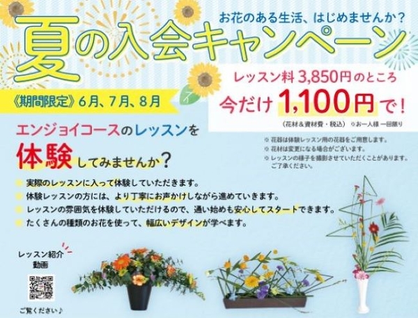 株式会社ジャパン・フラワー・コーポレーション(本社:富山県射水市、代表取締役社長:松村吉章)が運営する「花まつフラワーアカデミー」https://www.mankaen.jp/は、6月~8月の期間限定で、エンジョイコースのレッスンを特別価格で体験できる夏の入会キャンペーンを実施中です。