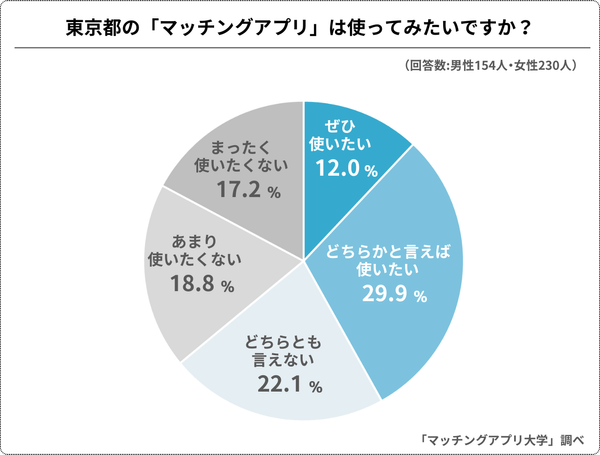 全国の18~39歳の未婚男女384人に「東京都のマッチングアプリを利用してみたいか」も尋ねてみました。