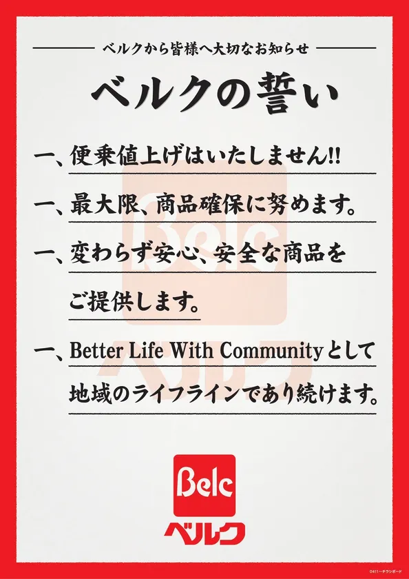 また、地域社会の食生活を担うライフラインとして、営業を継続させる事で、お客様に安心してお買物していただけるよう、「ベルクの誓い」を掲げます。