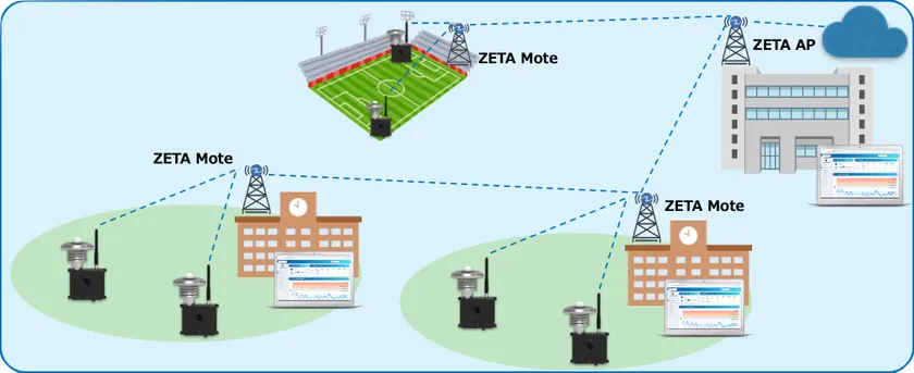 フィールドテストでは、ZETAの特徴であるMote(中継器)によるマルチホップによって、袋井市役所屋上(AP)~袋井北小学校(1stMote)~今井小学校(2ndMote)のZETA通信網を活用し、今井小学校の校庭に2台の温湿度センサーを設置するだけで、直ぐにWBGT値の表示を開始しました。