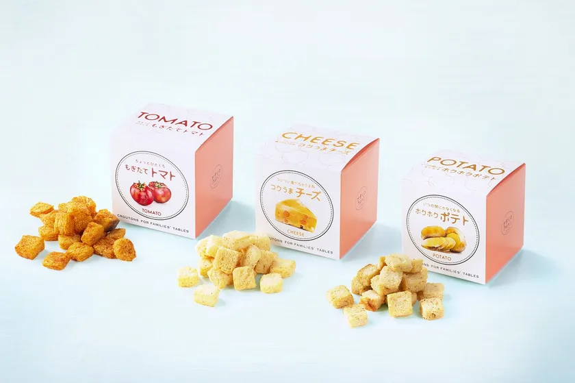 かぞくのクルトンは、食卓を囲む時間から、大切な人を想う心がつながって、たくさんの絆がつくられることを願い、「食卓がつくる、絆をもっと。」をコンセプトに、お子さまからお歳を召した方まで、幅広くお楽しみいただける豊富なラインナップをご用意しております。ティータイムのお菓子にはもちろん、スープやサラダ、デザートのトッピングとしてもお楽しみいただけます。