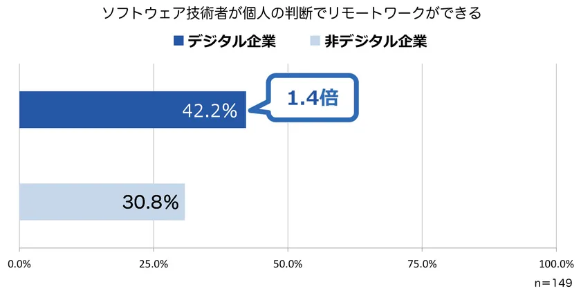 新型コロナウイルス感染症が拡大する以前に「個人判断でのリモートワークが認められている」と回答したデジタル企業は42%で、非デジタル企業の1.4倍となりました。また「副業の許可」や「ソフトウェア技術者用の給与テーブルがある」といった項目でもデジタル企業に大きな優位性が見られ、採用市場が加熱する技術者やデジタル人材に向けて、キャリア選択と成長機会を拡げ、採用・育成に繋げようとする動きが見られました。