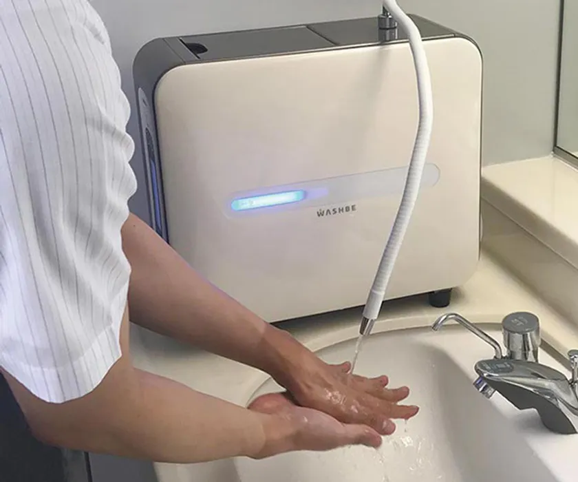 手洗い専用の洗浄水除菌水生成器。せっけんやアルコール消毒がいらないのに、しっかりと汚れを落として除菌できる。しかも手にやさしい。ウォシュビィは、今までになかった新発想のイオン交換式の手洗い器です。