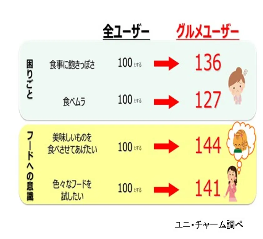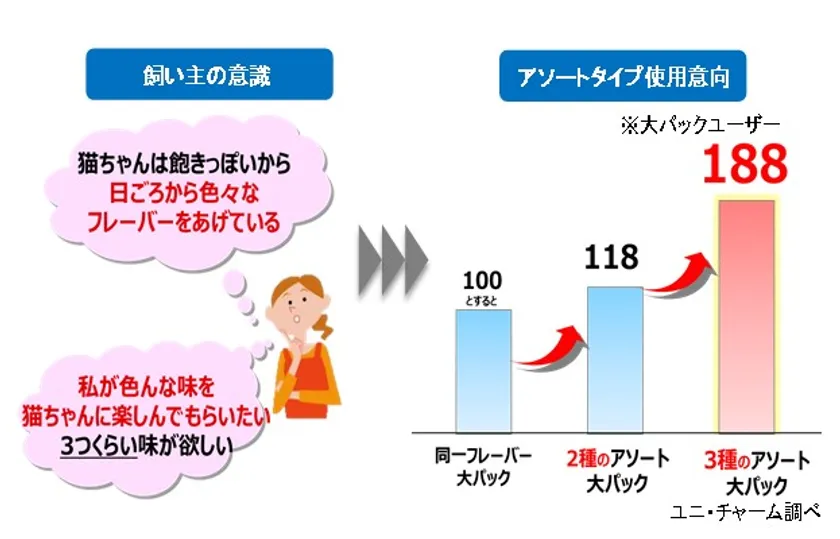 猫用フード市場は増加傾向にあり、2019年は前年と比較して102%成長しています。また、約80%が室内で飼育されていることから、猫と過ごす時間も長くなり、食事に対する意識も高まっています。特に、食事に対して気を遣う“グルメユーザー”は、猫ちゃんの「食事のあきっぽさ・食べムラ」に困っており、「美味しいものを食べさせてあげたい・色々なフードを試してみたい」という意識が高く、アソートタイプに対して高い使用意向を示しています。