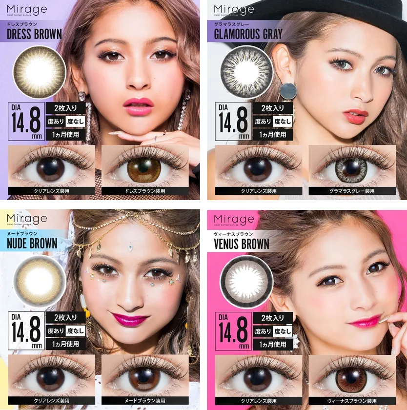 Mirageは『盛り』を重視する方におすすめな、「高発色」と「しっかりフチ」が特長のレンズブランドです。“STAY SHINE”をブランドメッセージとし、レンズでなりたい自分に変身することでキラキラと輝く時を過ごしてほしいという想いのもとに、シーンを問わずご使用いただける豊富なカラーと、盛れ度が選べる14.5mmと14.8mmサイズのレンズを展開しています。