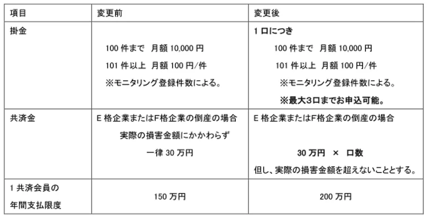 これまで1口(支払限度額30万円)が申込上限でしたが、信用リスクの増加に対応し3口までお申込みすることができるようになります。引き続きE、F格付で倒産した企業が見舞金の対象となります。