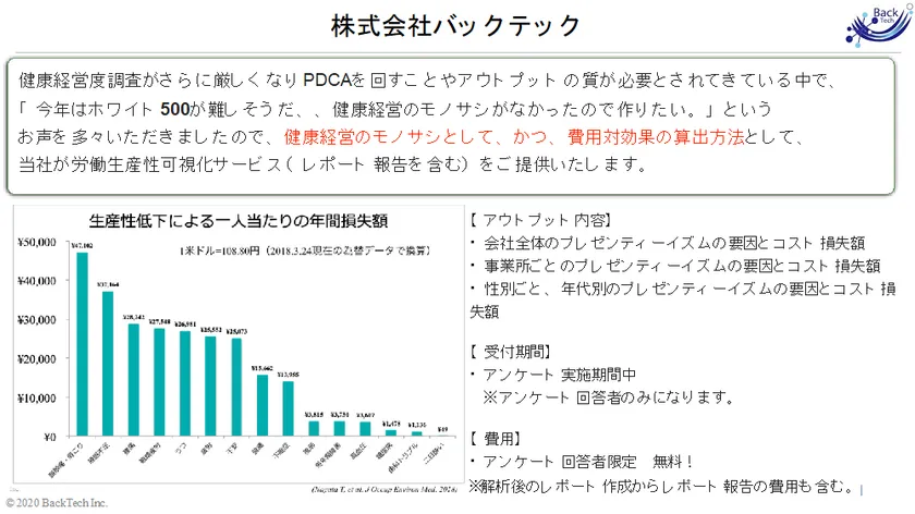 ウイルス感染予防のため、外出自粛の要請や在宅勤務が推奨され、都市部を中心にリモートワークへの移行が増えています。従業員の働き方の変化を迫られる企業が増え、健康経営施策の中止・延期や方針転換を模索している企業も多くなることが予想されることから、ヘルスケア分野で企業の健康経営施策やプレゼンティーズムの向上を支援するサービスを提供してきた3社共同で企業の健康経営の実態を調査することといたしました。企業が、従業員の健康を守るために必要としていることや、直面している課題の解決の一助になればと考え、調査結果も後日公開いたします。