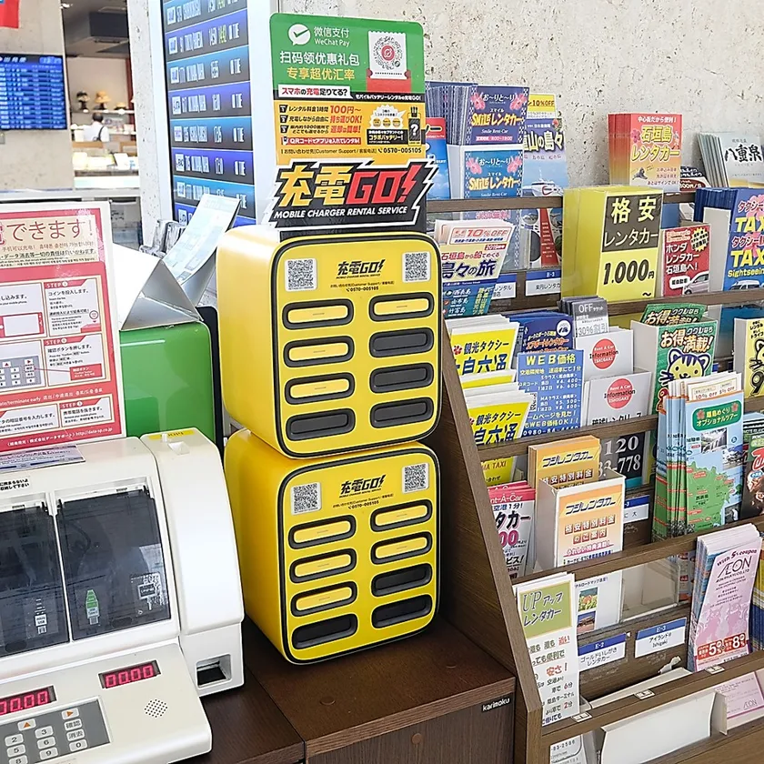 充電GO!は、2020年1月より開始したモバイルバッテリーのレンタルサービスです。専用のアプリで会員登録をした後は、バッテリーステーションでQRコードを読み取るだけの簡単レンタルで、自由に移動しながら充電をして、終わったら最寄りのステーションに返却できます。なお、ステーションは沖縄県内で約1,000カ所への設置を計画しており、南ぬ島 石垣空港において石垣空港ターミナルが管理・運営している国内線ターミナルビルの1階中央に設置してサービスを提供しています。