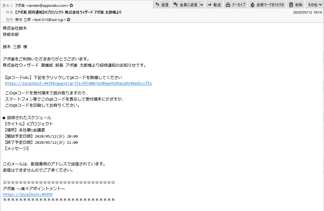 そこでacro-oneは、WebサイトからQRコードをメールでゲストへ発行し、ゲストはそのQRコードをスマートフォン上で表示して訪問先の受付に設置されたiPadへかざすと自動で担当者をメール・SMS(SMSは有料オプション)で呼び出す「アポ楽」を開発しました。この仕組みによりゲストは煩わしい受付票の記入と内線電話での担当者呼び出しから解放され、企業は訪問者の履歴を自動で保存されたデータベースから取り出す事が可能になります。また、「アポ楽」は、蓄積された訪問履歴から、一定の期間内の社員・ゲストの「接触者相関図」を分析・表示する事が出来ます。