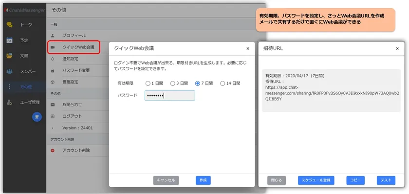 株式会社 Chat&Messenger(所在地:東京都港区、代表者:田辺 哲)は、ビジネスチャット、Web会議、スケジュール管理、ファイル共有、文書管理を統合した無料で使えるグループウェア「Chat&Messenger」に新機能「クイックWeb会議」をリリースいたしました。