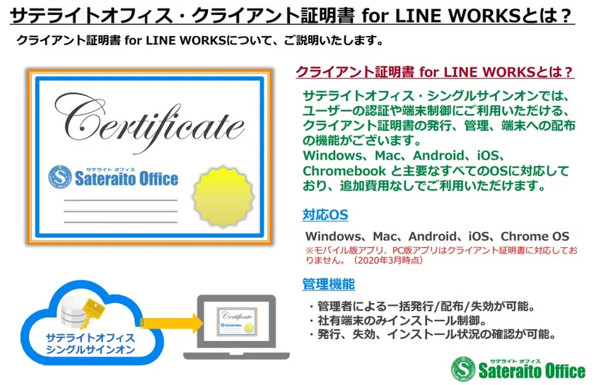 クラウド環境、サテライト環境でのビジネス支援に特化したインターネットシステムソリューションベンダーである株式会社サテライトオフィス(本社:東京都江東区、代表取締役社長:原口 豊、 https://www.sateraito.jp/ )は、ビジネス版LINE「LINE WORKS」導入企業向けに、クライアント証明書の発行/管理/配布ができるクライアント証明書機能の提供を開始したことを発表します。ユーザー認証や端末制御に使用可能です。「サテライトオフィス・シングルサインオン for LINE WORKS」の拡張機能として無償提供します。