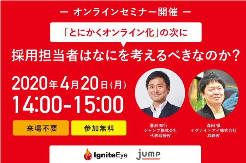 採用コンサルティングのジャンプ株式会社(本社:東京都新宿区、代表取締役:増渕 知行)は、2022年卒の新卒採用計画の本格的スタートに先駆けて、採用管理システムSONAR ATSを提供しているイグナイトアイ株式会社(本社:東京都千代田区、代表取締役社長:吉田 崇)と共催で、『「とにかくオンライン化」の次に、採用担当者はなにを考えるべきなのか?』セミナーを4月20日にオンラインで開催します。
