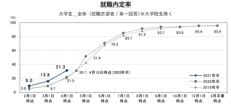 就職内定率は、31.3%で過去最高値。3月中は学生が企業と個別接点を持つ活動が進行