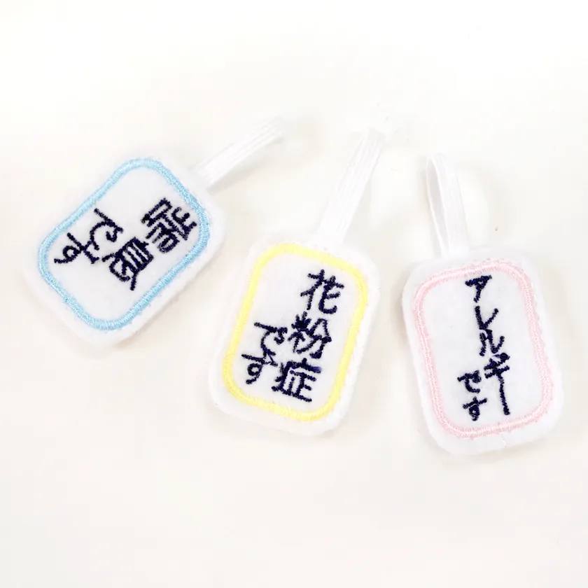 工房内の刺繍ミシンで「花粉症です」「喘息です」「アレルギーです」と、周囲に持病を知らせるメッセージを刺繍。
