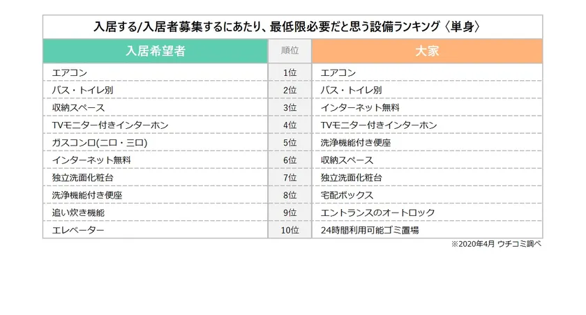 「入居する/入居者募集するにあたり、最低限必要だと思う設備ランキング」(単身)