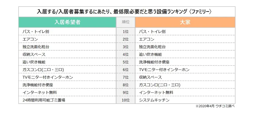 「入居する/入居者募集するにあたり、最低限必要だと思う設備ランキング」(ファミリー)