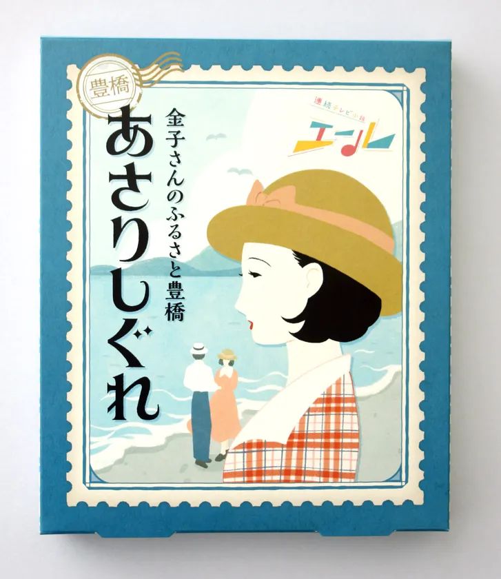 パッケージは、福島の海、豊橋の海を見つめて思いを馳せる二人、頻繁に交わされた文通をイメージして切手風にデザインしました。
