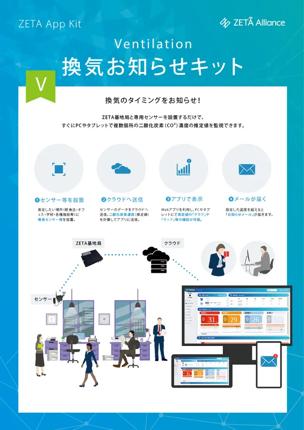 換気お知らせ(ZETA APP Kit - Ventilation)は、ビル管理法における空気環境の調整に関する基準項目の中から、容易かつ安価にセンシングが可能で人の生活に密接している、二酸化炭素、気温、相対湿度について5分毎に自動計測し、結果をリアルタイムに表示します。また、基準値を上回る計測値となった場合には、予め設定したアドレスにアラート・メールを自動送信します。さらに、LPWA規格であるZETAの通信ネットワークによって、複数の施設や空間について一元管理が可能です。二酸化炭素濃度による外気導入自動制御などの高度な空調管理を行うことが困難なビルや施設・店舗においても、連続した計測値のモニタリングによって、必要な換気を促すことが可能になります。また窓の開放や換気扇の運転、場合によっては入室人数の制限などに対して、数値を「見える化」することにより利用者に納得いただける環境を提供できます。