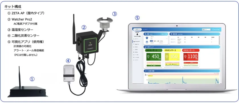 換気お知らせ(ZETA APP Kit - Ventilation)には、最新のIoT機器であるNB-Innovation社製の(1)二酸化炭素濃度センサーと通信ノードであるWatcher Pro2のセット、(2)センシングした計測値をZETA通信によってクラウドサーバーへ送信する、ZETA AP(ZETA基地局。データ送信用のSIMカード付き)、(3)デバイスとZETA通信を管理するZETA Cloud Platform、(4)センシングデータを校正・AI処理するNBIクラウドサーバーの利用料、(5)センシングデータを可視化し、アラートをメールで共有できるWebアプリの利用料など、サービス利用に関する全ての機能と製品が含まれています。