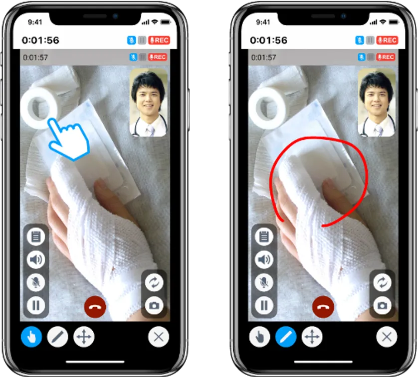 指示者はオプティムが開発した基本特許技術「Overlay Technology」(特許第5192462号)による赤ペン機能や、指差し機能を用いることにより、映してほしい箇所の指示や、症状の説明を的確に行うことができます。