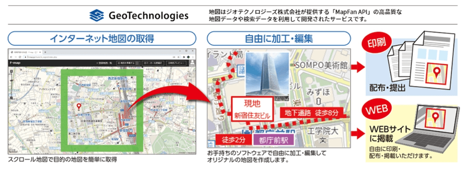 「F-map」は、著作権許諾付き(※)の地図画像を取得・利用できるインターネット地図サービスです。取得した地図は、自由に加工・編集して、あらゆる用途にご利用いただけます。