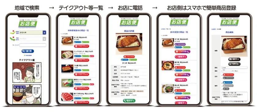 地域で検索→テイクアウト品一覧→お店に電話→お店側はスマホで簡単商品登録