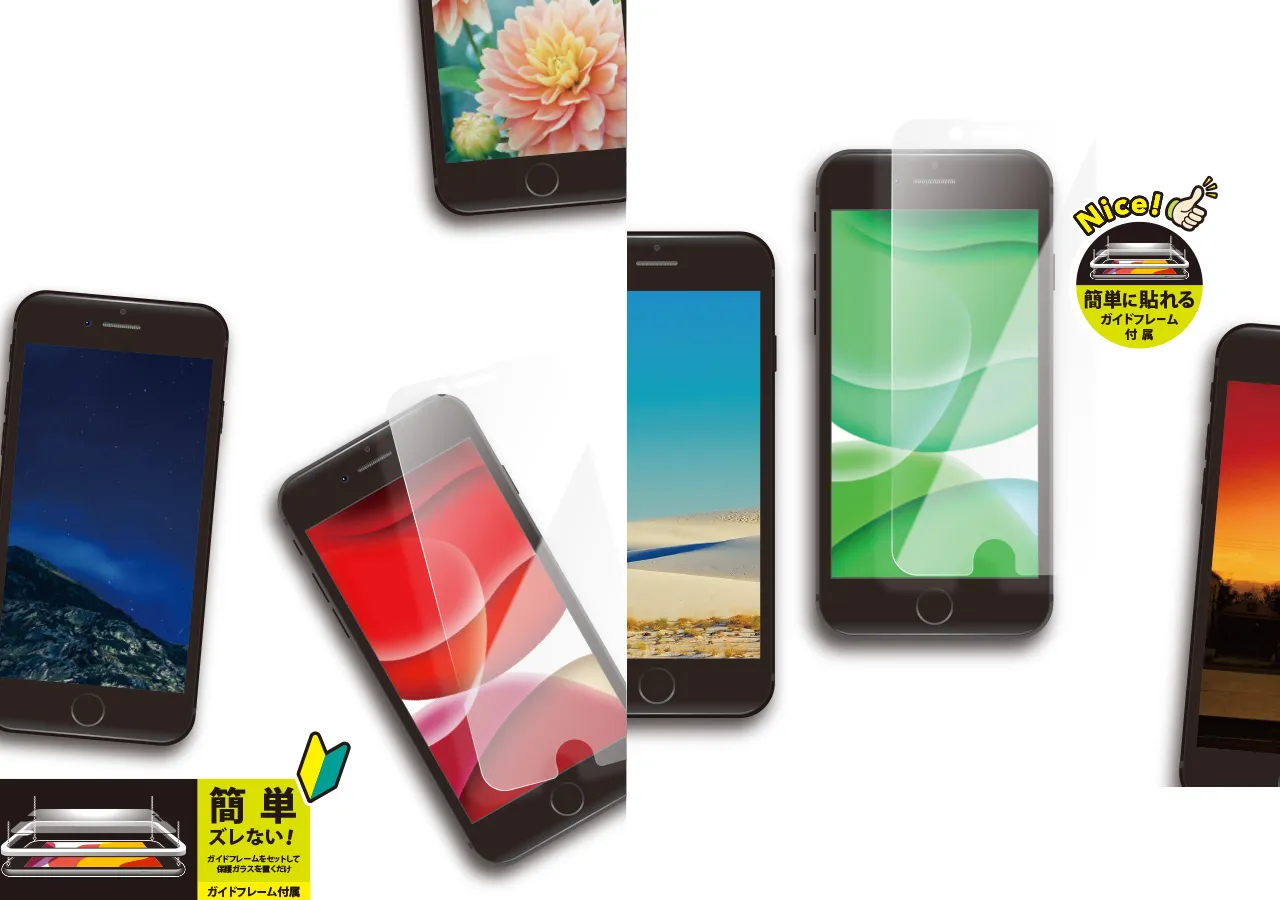 高硬度で傷を防ぐ液晶保護ガラスと安価で薄さと耐久性を追求した液晶保護フィルムも揃えました。全ての液晶保護ガラス、フィルムには貼り付けに便利なガイドフレームが付いており端末にかぶせてガラスやフィルムを置くだけで簡単に貼付けが出来ます。