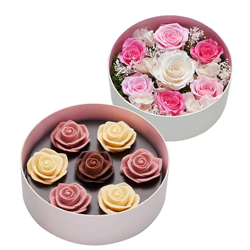 薔薇をブーケに仕立てた、透明感と気品のあるショコラボックスと薔薇のプリザーブドフラワーが2段セットになったフラワーギフトボックス。
