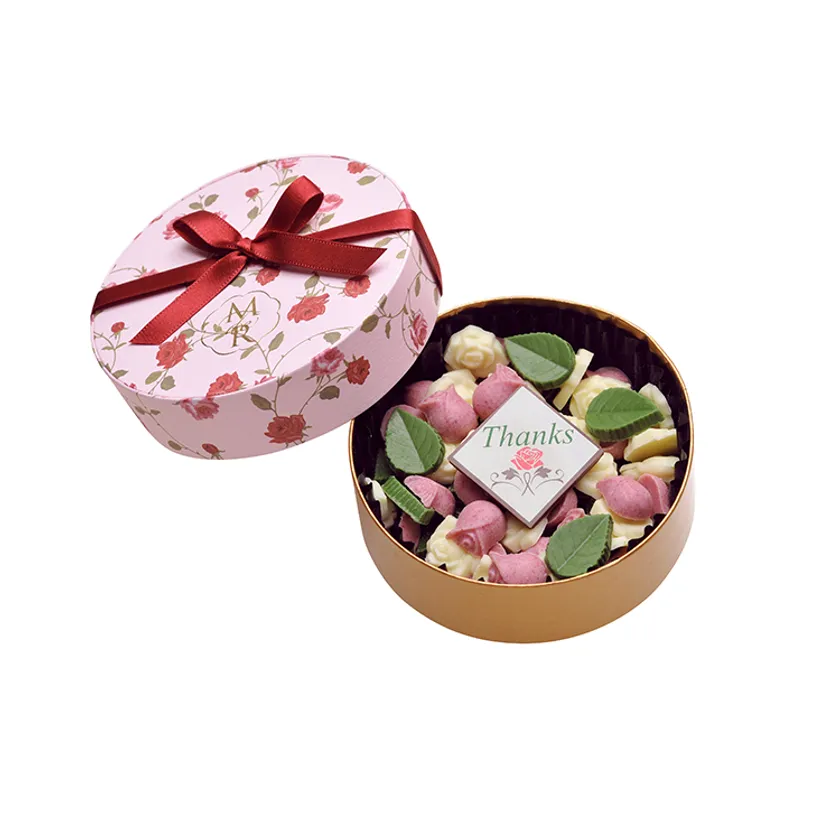 小さな薔薇を小花柄の箱に詰めたプチギフト。優しい甘さのチョコレートは1粒で幸せに。