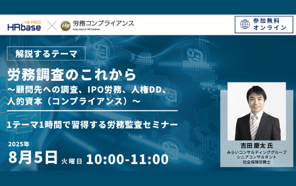 みらいコンサルティンググループ(本社:東京都中央区、代表:久保 光雄 岡⽥ 烈司)は、2025年8月5日にセミナー『~1テーマ1時間で習得する労務監査セミナー 社労士のための労務コンプライアンス調査~【第6回】 労務調査のこれから ~顧問先への調査、IPO労務、人権DD、人的資本(コンプライアンス)~』をWEBにて開催します。