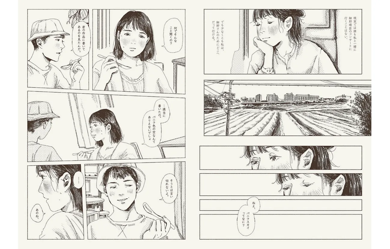 漫画は3編収録していて、「序章」と「クジラ」はグレーの紙を選びましたが、「隙間とバニラスカイ」は黄色に変えました。最後のページに描かれた雨上がりの空をめくった時に、「空は本当にバニラ色なのだ」と連想していただきたいからです。