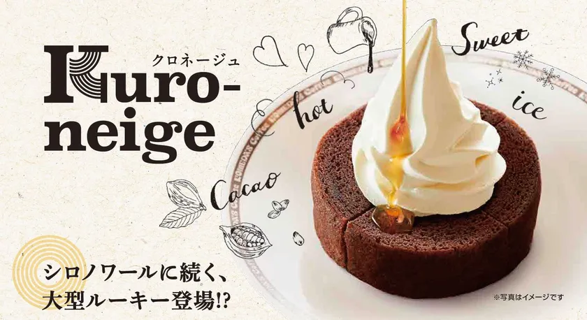 ココア色のバウムクーヘンの上に白い雪山のようなソフトクリームが乗っている、その見た目が由来です。クロ(ココアの濃い色合い)とフランス語で“雪”を意味する“ネージュ”と組み合わせて、「クロネージュ」と名付けました。コメダの定番メニュー「シロノワール」と同じく、温かいバウムクーヘンと、冷たいソフトクリームの“温”と“冷”の相反する2つの組み合わせという意味も込められています。