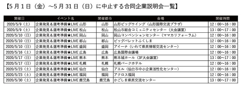 ●2月20日『リクナビ2021』合同企業説明会 3月1日から31日まで中止を決定