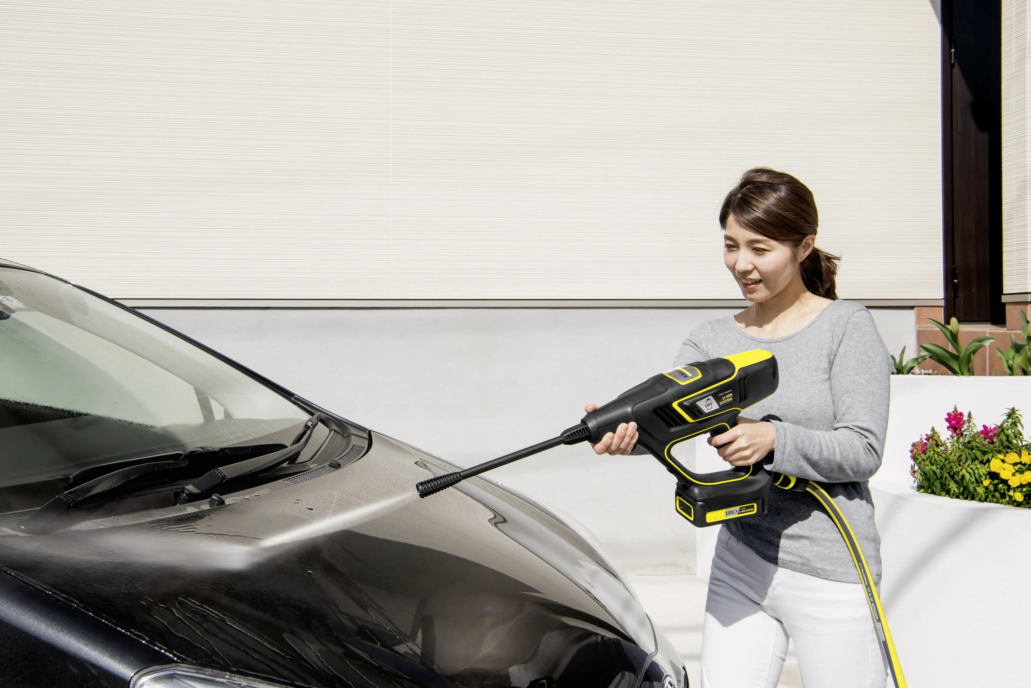 コードレスで手持ちタイプのクリーナー。水道ホースの接続だけで使用できるので、集合住宅などの電源が確保できない駐車場での洗車にぴったりです。