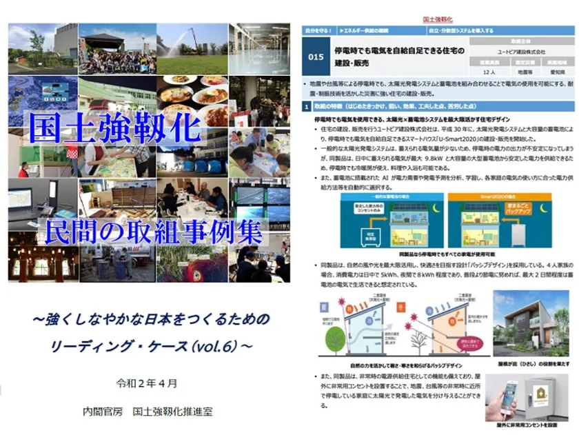 ユートピア建設株式会社(所在地:愛知県岡崎市、代表取締役:山口雅弘、以下「当社」)は、内閣官房国土強靭化推進室が令和2年4月に刊行した『国土強靭化 民間の取組事例集』に「停電時でも電気を自給自足できる住宅の建設・販売」として紹介されました。