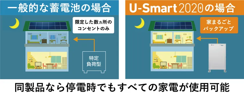 当社の家づくりのコンセプトは「命を守る防災住宅」です。2018年より、太陽光発電システムと大容量の蓄電池により、停電時でも電気を自給自足できるスマートハウス「U-Smart2020」の建設・販売を開始。これまで台風による停電時でも「我が家だけは普段の生活ができた」と大変高い評価をいただいてまいりました。