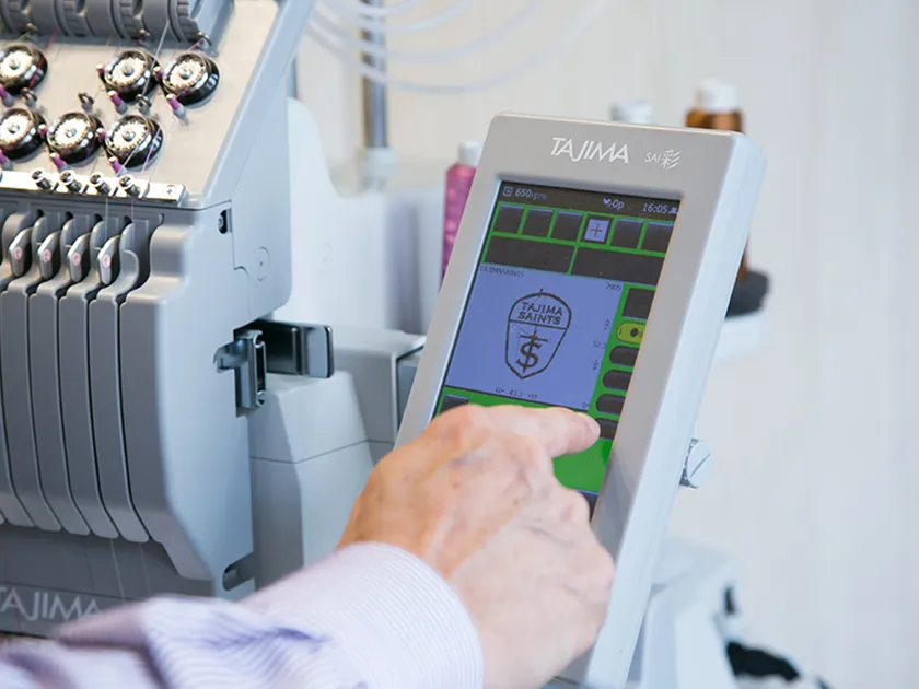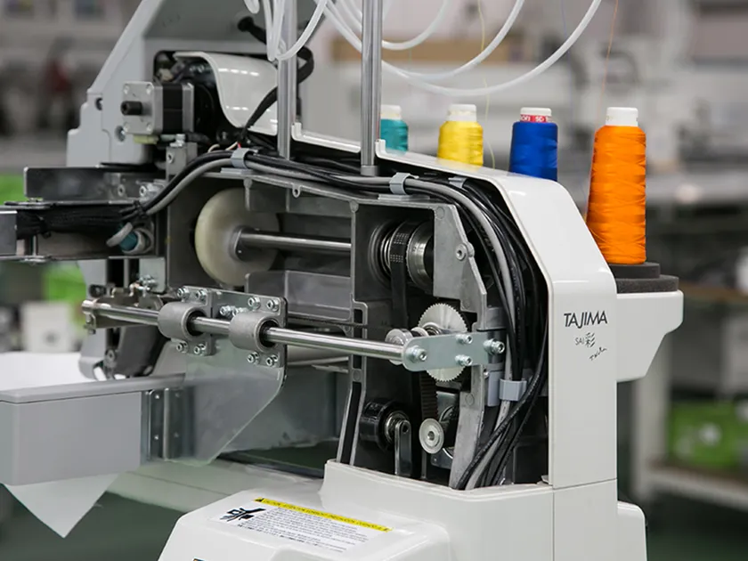 60年以上の歴史の中で、世界中の有名ブランドから信頼を集め、生産現場に多数導入されてきたタジマの刺しゅうミシン。そのひとつ「TAJIMA SAI -彩-」は、プロから必要とされる性能をそのままに、コンパクト化したタイプです。細かい線や広い部分も美しく仕上げ、高いパフォーマンスで、名入れやオーダー刺しゅうなど、アイデア次第で新しいサービスを生み出し、様々なビジネスシーンで活躍します。