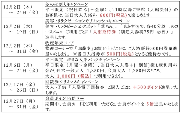 つかしん天然温泉「湯の華廊(R)」、「年明け前のリフレッシュキャンペーン」を開催