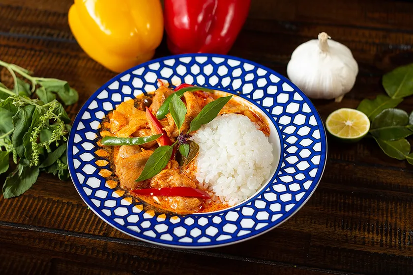 厳選した鶏肉とレッドカレーペーストで炒め、こぶみかんの葉とタイのバジルがアクセントです。見た目ほど辛味はないですが、一度食べたら止まりません。