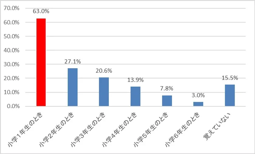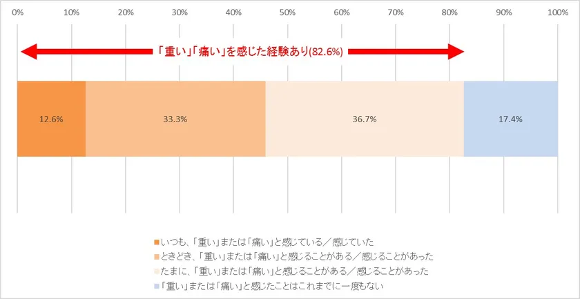 はじめに、ランドセルを使っていて「ランドセルが重い、体が痛い」と感じた経験を質問したところ、その経験がある小学生は82.6%となり、多数の小学生がランドセルによる重みや痛みを感じた経験があるという結果となりました【図1】。なかでも「小学1年生のとき(から)」に重さ・痛みを感じたという回答は63%に上り【図2】、最も多い痛みは「肩の痛み(54.2%)」との結果となりました。さらに高学年では約5人に1人がランドセルによる肩こりを経験しているという結果となりました【図3】。またWebアンケートとは別日に実施した小学生の座談会(定性補足調査)では「金曜日だけランドセルが重い」、「骨がガシーンとなるくらい痛い」などランドセル中身の重さや、痛みに関する子供の率直な意見も数多く聞こえてきました。