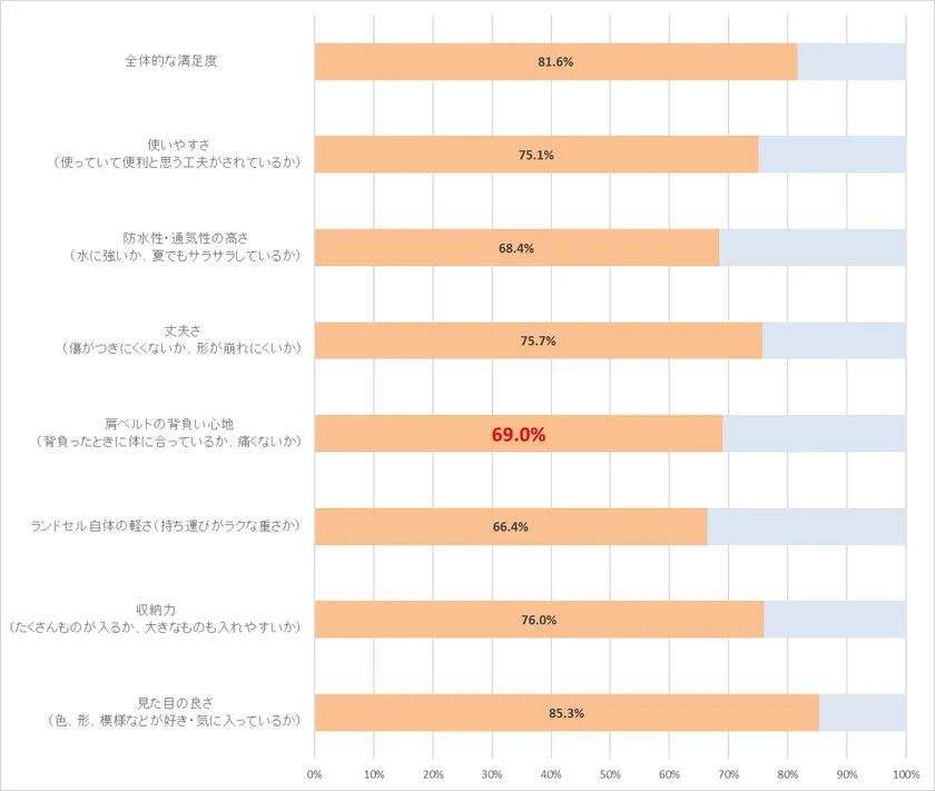 ランドセルの重さ・体の痛みを感じる子どもが多く、親も子供の姿勢やランドセルの重さからくる背負い方を気にしている一方で、親がランドセルを購入する時に重視することの1位は「子どもが好きな色・デザイン・ブランドであること(50.0%)」と機能より見た目が重視される結果が明らかに【図8】。ランドセルに対する全体的な満足度も親81.3%、子81.6%と高い満足度が得られている一方、肩ベルトの背負い心地(背負ったときに体に合っているか、痛くないか)に関する満足度は親69.0%、子69.0%と見た目には満足しつつも背負い心地の機能には満足していない一面も浮き彫りとなりました【図9、10】。また、親が選び直すなら重視したいことでは1位「ランドセル本体が軽いものを選びたい(30.3%)」、2位「子どもが好きな色・デザイン・ブランドを選びたい(28.9%)」、3位「子どもが背負ったときに痛くないものを選びたい(24.1%)」と次に買うなら見た目よりも機能を優先したい実情が明らかになりました【図11】。